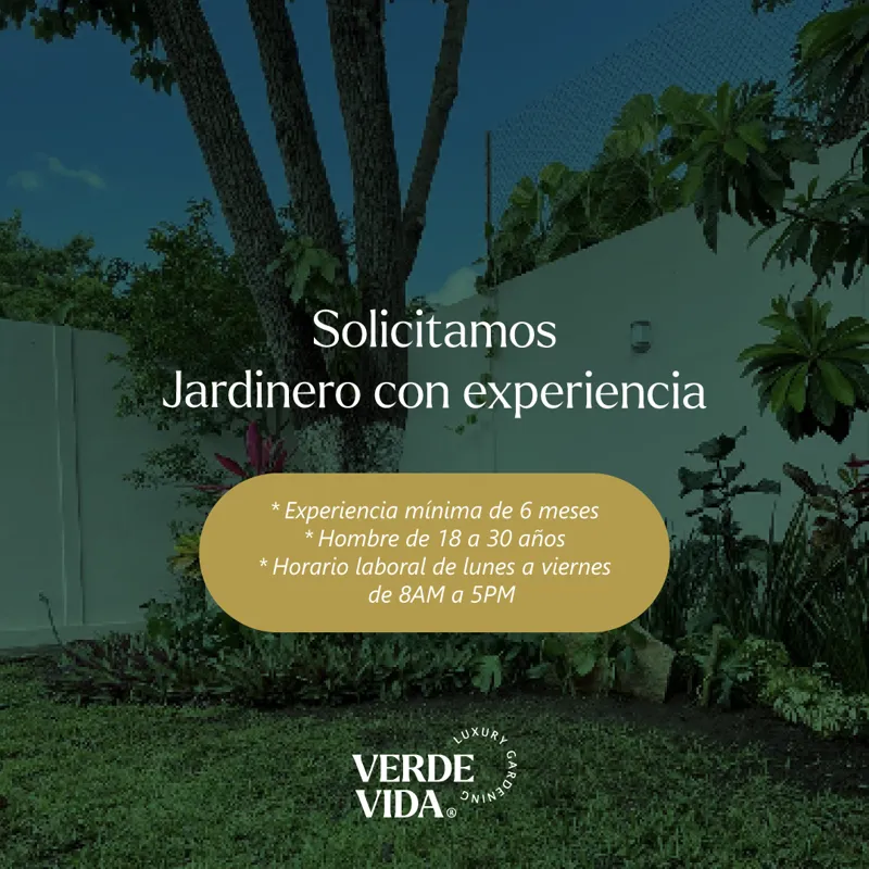 Forma parte de nuestro equipo. Verde Vida Luxury Gardening, empresa de paisajismo y jardinería profesional con más de 10 años en el mercado, solicita jardinero con experiencia:Mayor a 18 añosHombreContar con experiencia previa en jardineríaSueldo semanal $1,700 más bonos/comisiones. Horario laboral de Lunes a Viernes de 8AM a 5PM y sábados de 8AM a 1PM.Detalle de las condiciones laborales en entrevista. Importante enviar mensaje al WhatsApp: 9991270072.